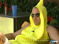 Days 23 & 24 - July 27 & 28, 2009 >> past >> present >> future >> all >> Jessie is Head of Household - Michele used veto - Jordan & Casey are nominated << >> Tweeting Big Brother since BB8 - click to see all or follow - latest: Tuesday: Trashbag chic with sneakers It's a brief combo episode today.. in short: everyone got new shoes and assumed they'll have an endurance comp on Thursday, which sounds likely since it was this week last year.. they also got oversize golf clubs and some assumed it'd be a golf comp, which doesn't sound likely since they look like the same oversize clubs they've given them for two or three seasons nowCasey became the first nominee this season and the first banana ever to campaign for votes.. every conversation was leaked, releaked, and rehashed for hours, as were the several spats that kept erupting.. Lydia & Natalie joined forces to make trashbag outfits, after facing off for a minute about Jessie.. and in a stunning moment of déjà vu, Russell convinced Jessie who convinced Natalie & Chima that Ronnie lies Check the Lines of the Day and catch some of the highlights on my Twitpic, my Twitter, and the Flashback times below.. big thanks to Bit o'Bunny who caught Kevin brushing his teeth this morning! and to Attw x for invaluable help of all kinds Monday: Now the banana's got something to be angry about Michele veto'd herself off the block as expected, and Casey went up in her place.. he's still grouching of course, and still making personal insults about Ronnie's wife Michelle - that seems a bit surprising for a 5th grade teacher? Maybe it's just me.. equally surprising is that she's rising to the bait and reacting to that stuff as well as to the haters online, providing them more ammoCasey was upset naturally, but Jeff's reaction has made me reinstitute his drinking game.. among other things, he said about Jessie's speech: "Number one, when you zing somebody, you don't wear another man's clothes; number two, you don't hide behind a pair of sunglasses, you look somebody in the eyes; number three, nobody gives a fuck about season 10 of Big Brother - get over it dude, you lost".. I'll raise my glass to that, especially number three.. <clink> Ronnie left a poopy mess which Kevin cleaned up.. Russell dove into the pool and banged his head, and feedsters went wild demanding medical attention that he did not want.. Natalie slipped up with her age lie and Chima may have caught it.. beyond that, it was the most uneventful day and night in BB feeds history..... until 2am when Michele spilled everything about her invitation to team up with Jeff/Jordan/Kevin/Lydia to Ronnie/Jessie/Natalie plus Chima - again, how did Chima get so chummy so fast with that crowd? Feeds highlights If you have SuperPass you can watch anything you missed, or see it again.. just enter the date, time and feed on the FlashBack page 7/27 - 1pm - F1/2 - Jeff & Casey comedy after veto meeting 7/27 - 5.30pm - All - Jordan discusses her boob job 7/27 - 6pm - F3/4 - Casey's sad banana song 7/28 - 1.55am - F3/4 - Michele spills the beans 7/28 - 8.30pm - F1/2 - Ronnie & Casey spat 7/28 - 10.30pm - F1/2 - Russell & Casey eavesdrop on F3/4 Ronnie, Lydia, Kevin 7/28 - 10.50pm - F3/4 - Casey goes after Ronnie again, kinda, and Lydia screams at him 7/28 - 11pm - F3/4 - Casey & Lydia face off, kinda 7/29 - 12.50am - All - Lydia & Natalie face off, kinda Random caps of the day These are my most recent screencaps - click thumbnails to enlarge or click here to see more.. you can log in using your Twitter nick and password to leave comments on any cap, and your comment will also be automatically posted to your Twitter.. use #BB11 in all tweets and comments for a clickable link to tweet with other feedsters Daily Ratings - Oral Hygiene special edition Ratings based on entertainment value will resume Tuesday Wednesday
