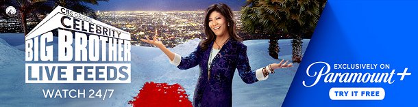 ![]() BIG BROTHER LIVE FEEDS EXCLUSIVELY ON PARAMOUNT PLUS All Big Brother USA seasons plus most CBS/BET/Comedy Central/MTV/Nickelodeon shows past or present are included, plus originals! Several seasons of BB Canada and BB Australia are coming in February! GET A FREE TRIAL COMPUTER - MOBILE - ROKU - CHROMECAST - APPLE TV - ANDROID TV - FIRE TV - XBOX 1/360 >> Status/Schedules >> Daily Recaps >> Ratings >> Lines & Links of the Day >> Tallies >> Season Stats >> Permalink this page: http://www.hamsterwatch.com/bb23/cbbus3.shtml Power StatusAlliance charts by @89razorskate20Alliance maps by @Dolffica Diary segment tallies by @clamperls4 GET THE FEEDS to see the real show!CBS All Access is now Paramount Plus! Plans are as follows: -$4.99/month includes feeds, does not have live local CBS, does have commercials for shows/movies -$9.99/month includes feeds, does have live local CBS, does not have commercials for shows/movies -Either is also available on an annual plan. If you get the $4.99 plan and want to dump the ads, you can upgrade to $9.99 plan at any time $5.99/month plan is no longer available for new subscribers, but former All Access accounts will stay as they were, including feeds and live local CBS Upcoming EventsBig Brother Canada 10 premieres March 2, 2022Click for info, stats, how to watch from outside Canada Big Brother Canada and Australia are now on Paramount Plus - Canada seasons 1 thru 7 plus 9 and Australia seasons 12, 13 Get a free trial! Celebrity Big Brother 3 premiered February 2, 2022 at 8pm - Get the feeds to see the real show! Celebrity BB Air Show Schedule & Overnight RatingsTimes are EasternWednesday, February 2 8pm - Premiere -1st place - 0.7 rating - 3.659 million viewers Thursday, February 3 9pm -2nd place (behind Olympics) - 0.5 rating - 2.655 million viewers (final ratings) Friday, February 4 8pm - live, two hours -3rd place (behind Olympics, and Shark Tank+20/20) - 0.4/0.3 rating - 2.414/2.092 million viewers Sunday, February 6 8pm -3rd place (behind Olympics, and Celebrity Wheel of Fortune rerun) - 0.4 rating - 2.517 million viewers Monday, February 7 9pm - live -4th place (behind Olympics, The Bachelor, The Cleaning Lady) - 0.4 rating - 2.286 million viewers Wednesday, February 9 8pm -2nd place (behind Olympics) - 0.6 rating - 2.851 million viewers Friday, February 11 8pm - live, two hours -4th place (behind Olympics, Jeopardy & 20/20, Friday Night Smackdown) - 0.4/0.4 rating - 2.524/2.342 million viewers Sunday, February 13 8pm -2nd place (miles behind Super Bowl) - 0.26 rating - 1.51 million viewers (final ratings) Monday, February 14 9pm - live -4th place (behind Olympics, The Bachelor, The Cleaning Lady) - 0.4 rating - 2.535 million viewers Wednesday, February 16 8pm -3rd place (behind Olympics, Jeopardy) - 0.5 rating - 3.003 million viewers Friday, February 18 8pm - live, two hours -2nd place first hour (behind Olympics) - 0.5 rating - 2.745 million viewers -- 4th place second hour (behind Olympics, Friday Night Smackdown, 20/20 rerun) - 0.4 rating - 2.332 million viewers Saturday, February 19 8pm - season clips -3rd place (behind Olympics, Jeopardy) - 0.2 rating - 1.513 million viewers Sunday, February 20 8pm -2nd place (behind Olympics) - 0.4 rating - 2.842 million viewers Monday, February 21 9pm - live, two hours, double eviction -4th place first hour (behind America's Got Talent Extreme, The Bachelor, The Cleaning Lady) - 0.4 rating - 2.463 million viewers -- 3rd place second hour (behind The Endgame premiere) - 0.4 rating - 2.265 million viewers Wednesday, February 23 8pm - live finale -2nd place (behind Chicago Med) - 0.8 rating - 6.943 million viewers Preliminary overnights: adults 18-49; Rating: % of all TV households Daily Feeds Recaps
