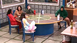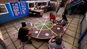 Today was the slowest yet, with lots of laying around and napping, and highlights like Morgan organizing the fridge, but an evening booze delivery arrived changed that. They sat around the table in a graphic depiction of who's getting evicted, rehashing the season and discussing their former roomies. A few small revelations came out, Rachel's name came up a lot, and Keanu made some digs about Vince. Ashley wandered off, Morgan went to look for her and she'd fallen asleep in the lounge. Morgan said she's angry at Keanu, they were having a chill night and it all got so awkward she had to leave. When Morgan went back to the fray, Ashley said to us "the drama, I'm stirring the pot, I'm planting seeds." Ashley rejoined the group and things escalated, thanks to more seeds. Keanu said he and Rachel were working with and for each other, and Ashley said he wasn't Rachel's number one and "she didn't need you." Keanu said Ashley doesn't know anything, Ashley said Keanu doesn't know anything, and that everyone's talked about Keanu always expecting people to do his bidding. Ava had been loud and sippy earlier and she got louder, asking why are they still talking about Rachel, and "can I enjoy my cheese dip!" Keanu said Vince is going to win second place rather than first, unless he wins veto and takes out Morgan.